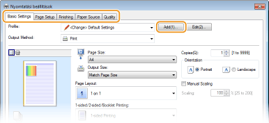 Kattintson az [Basic Settings] (Alapbeállítások), [Page Setup] (Oldalbeállítás), [Finishing] (Befejező művelet), [Paper Source] (Papírforrás), vagy [Quality] (Minőség) fülekre, és adja meg mindegyik képernyőn igény szerint a nyomtatási beállításokat.