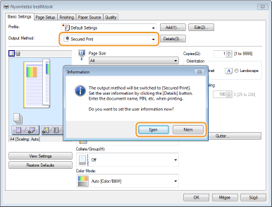 Válassza a [Secured Print] (Védett nyomtatás) lehetőséget a [Output Method] (Kimeneti mód) beállításban.