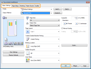 Kattintson az [Basic Settings] (Alapbeállítások), [Page Setup] (Oldalbeállítás), [Finishing] (Befejező művelet), [Paper Source] (Papírforrás) vagy [Quality] (Minőség) lapra, és igény szerint adja meg mindegyik képernyőn a nyomtatási beállításokat.