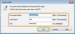 Adja meg a következő adatokat: [Document Name] (Dokumentum neve), [User Name] (Felhasználónév) és [PIN], majd kattintson az [OK] gombra.