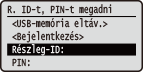 Amikor a felhasználók a kezelőpanelről megkísérelnek kinyomtatni egy, az USB-memóriaeszközön tárolt fájlt vagy az SD-kártyán tárolt dokumentumot, megjelenik a hitelesítési képernyő. Adja meg a részlegazonosítót és a PIN-kódot, válassza a <Bejelentkezés> lehetőséget, majd nyomja meg a  gombot.