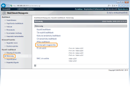 A jelölőnégyzet bejelölése esetén eszközfelügyeleti szoftverek, például az imageWARE Enterprise Management Console használatával lekérheti a nyomtatási előzményeket. Ha nem szeretné, hogy eszközfelügyeleti szoftverekkel lekérhetők legyenek a nyomtatási előzmények, akkor törölje a jelet a jelölőnégyzetből. Ezt a funkciót a [Munkanapló megjelenítés] jelölőnégyzet bejelölése esetén automatikusan engedélyezi a készülék.