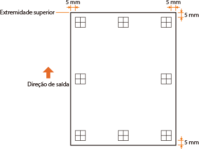 são impressas. Determine a direção e a distância para ajustar com base nessas marcas. Quando a posição de impressão está normal, todas as marcas são impressas em uma posição 5 mm a partir da borda mais próxima do papel.