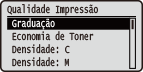 As configurações de qualidade da impressão incluindo gradação e densidade do toner são listadas com breves descrições. As configurações padrão são marcadas com uma cruz (