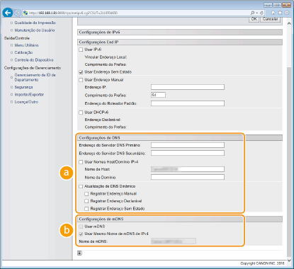 Marque a caixa de seleção para atualizar dinamicamente os registros DNS sempre que o endereço IP da máquina é alterado. Para especificar o(s) tipo(s) de endereços que deseja registrar no servidor DNS, marque a caixa de seleção para [Registrar Endereço Manual], [Registrar Endereço Declarável] ou [Registrar Endereço Sem Estado]. [Configurações de mDNS]/[Configurações de Opção DHCP][Usar mDNS]