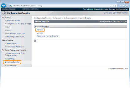 Carregue (importe) os dados que foram exportados da máquina. Você pode também importar as configurações de uma outra máquina se ela for do mesmo modelo da sua.