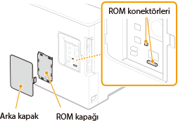 Bu bölümde isteğe bağlı ROM'un makineye nasıl takılacağı açıklanmıştır. ROM, makinenin arka kapağının içindeki konektörlere bağlanarak kullanılır. ROM'u takmadan önce, Kurulum içindeki uyarıları okuyun.