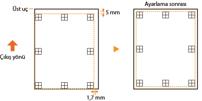 yazdırılır. Ayarlanacak yönü ve uzaklığı, bu işaretleri temel alarak belirleyin. Yazdırma konumu normal olduğunda, tüm işaretler kağıdın en yakın kenarından itibaren bir konumda 5 mm yazdırılır.