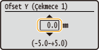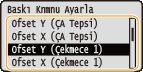 Tüm yazdırma işleri için yazdırma konumlarını kağıt kaynağından bağımsız olarak ayarlamak için, işletim panelindeki ayar menüsünde <Ofset Y> ve <Ofset X> öğelerini kullanabilirsiniz. Yazdırma konumunu -50,0 - +50,0 mm aralığında 0,5 mm değerinde kademelerle her iki yönde de ayarlayabilirsiniz: Dikey ve yatay. Ofset Y/Ofset X
