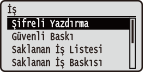 ( ) öğesine bastığınızda, İş menüsü görüntülenir. Aşağıda açıklanmış ayarları, makine çevrimdışı iken belirtebilirsiniz. |