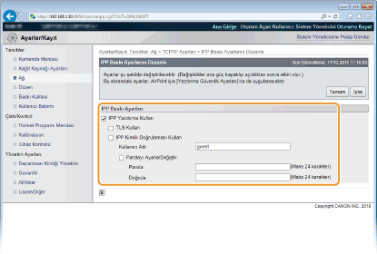 [IPP Kimlik Doğrulaması Kullan] IPP yazdırma için kullanıcı kimlik doğrulaması işlevini kullandığınızda, bu onay kutusunu seçin ve kullanıcı adını ve parolayı ayarlayın. Kullanmadığınızda, onay kutusunun işaretini kaldırın.