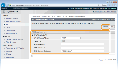 [SMB Ayarları] Altındaki [Çalışma Grubu Adı] içinde ayarlanan bir çalışma grubu adı, eğer mevcutsa, [SMB Çalışma Grubu Adı] öğesi için otomatik olarak kullanılır. Eğer, [SMB Çalışma Grubu Adı] içinde çalışma grubu adına ilişkin bir değişiklik yapılırsa, bu ayrıca, [SMB Ayarları] altındaki [Çalışma Grubu Adı] için de uygulanır.