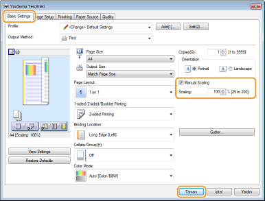 Bazı uygulamalardaki büyütme/küçültme ayarları, yazıcı sürücüsündeki ayarlardan önceliklidir.