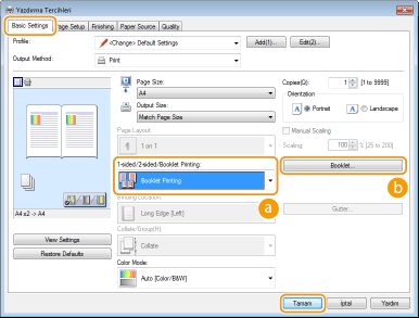 Ayrıntılı ayarları gereken biçimde belirtmek için [Booklet] öğesine tıklayın