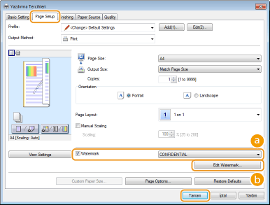 Filigranın metnini, rengini veya yazdırma konumunu belirtmek için her bir sekmeyi tıklatın. Daha fazla bilgi için, yazıcı sürücüsü ekranında [Help] (Yardım) düğmesini tıklatın.