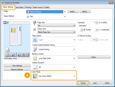 Bir renk modu (renkli veya siyah beyaz) seçebilirsiniz. Bir belgede hem renkli hem de siyah beyaz sayfalar varsa, otomatik modu belirtilerek otomatik şekilde renkli sayfalar renkli, siyah beyaz sayfalar da siyah beyaz yazdırılır.