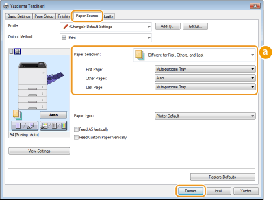 İlk sayfa, gövde sayfaları ve son sayfa için farklı kağıt kullanabilirsiniz. Örneğin, [First Page] (İlk Sayfa) için çok amaçlı tepsideki kağıdı, [Other Pages] (Diğer Sayfalar) için kağıt çekmecesindeki kağıdı (gövde sayfaları) ve [Last Page] (Son Sayfa) için çok amaçlı tepsideki kağıdı seçebilirsiniz. Ayrıca [Paper Type] (Kağıt Türü) seçeneğinde kağıt türünü belirterek yazdırabilirsiniz.