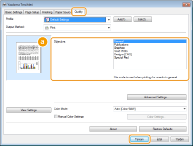 [Objective] (Hedef) içinde seçilen her bir öğenin ayrıntılı ayarlarını belirtmek için, [Advanced Settings] (Gelişmiş Ayarlar) öğesini tıklatın. Daha fazla bilgi için, yazıcı sürücüsü ekranında [Help] (Yardım) düğmesini tıklatın.