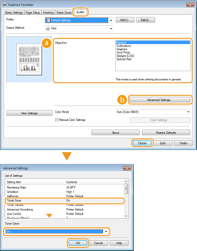 [Advanced Settings] (Gelişmiş Ayarlar) ekranında, toner tasarrufu ayarlarından başka çeşitli yazdırma ayarları belirtebilirsiniz. Daha fazla bilgi için, yazıcı sürücüsü ekranında [Help] (Yardım) düğmesini tıklatın.
