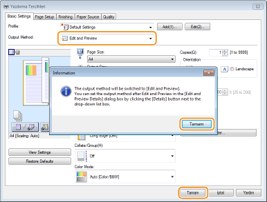 [Output Method] (Çıkış Yöntemi) İçinde [Edit and Preview] (Güvenli Yazdırma) öğesini seçin.