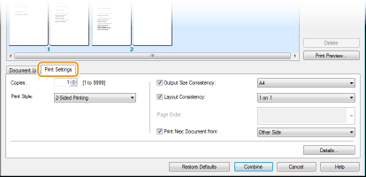 Kopya sayısı veya 1 taraflı/2 taraflı yazdırma gibi yazdırma ayarlarını belirtme ekranını görüntülemek için [Print Settings] (Yazdırma Ayarları) sekmesini tıklatın. Burada belirtilen ayarlar, yazdırma işinin tamamına uygulanır.
