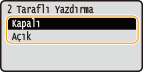 <2 Taraflı Yazdırma> bazı kağıt boyutları veya türleri ile birlikte kullanılamayabilir.