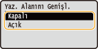 Eğer <Açık> öğesini seçerseniz, orijinaline bağlı olarak resmin bazı kısımları kağıdın kenar bölgesinde eksik yazdırılabilir ya da kağıt kısmen lekelenebilir.