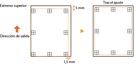. Determine la dirección y la distancia para ajustar a partir de esas marcas. Si la posición de impresión es normal, todas las marcas se imprimen en una posición 5 mm del borde más cercano del papel.