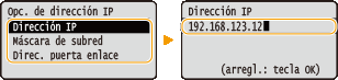 Especifique la dirección IP, la máscara de subred y la dirección de puerta de enlace (o la puerta de enlace predeterminada).