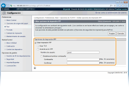 [Autenticación IPP] Si utiliza la función de autenticación de usuario para la Impresión IPP, seleccione la casilla de verificación y configure el nombre de usuario y la contraseña. Si no lo usa, quite la marca de la casilla de verificación.