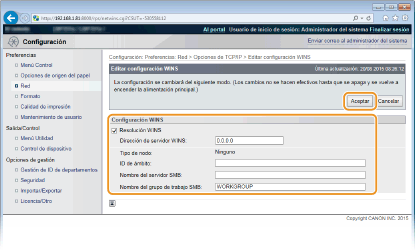 Si la dirección IP del servidor WINS se obtiene desde un servidor DHCP, la dirección IP obtenida sustituye a la dirección IP introducida en el cuadro de texto [Dirección de servidor WINS].
