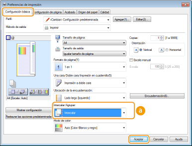 Pestaña [Configuración básica] Seleccione [Intercalar] o [Agrupar] en [Intercalar/Agrupar] [Aceptar]