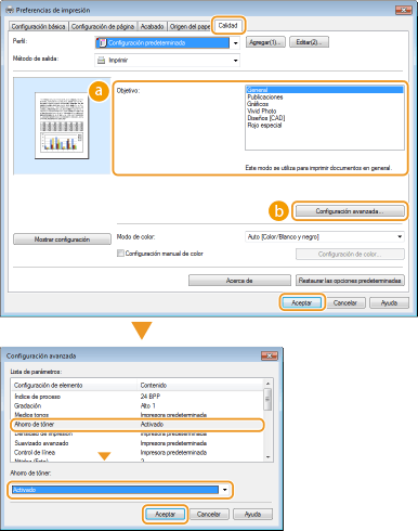 Pestaña [Calidad] Seleccione el tipo de documento en [Objetivo] Haga clic en [Configuración avanzada] Seleccione [Ahorro de tóner] en la pantalla [Configuración avanzada] Seleccione [Activado] en la lista desplegable [Aceptar] [Aceptar]