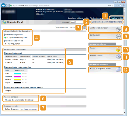 Muestra información sobre el papel (cantidad restante, tamaño, etc.), la cantidad de tóner restante en cada cartucho y la capacidad restante del depósito de tóner residual.
