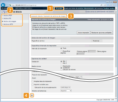 Muestra la página [Monitor estado/Cancelar]. Puede usar esta página para comprobar el estado de impresión actual, cancelar la impresión y ver un historial de los trabajos de impresión.