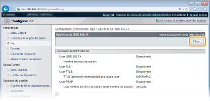 Uso del panel de controlTambién puede habilitar o deshabilitar la autenticación IEEE 802.1X desde el menú de configuración del panel de control. IEEE802.1X