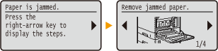 In some cases when an error occurs, instructions on how to respond to the error are displayed. Follow the on-screen instructions to solve the problem. The screen displayed when a paper jam occurs is shown below as an example. When an Error Message Appears