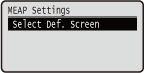 The setting items about the main screen on MEAP are listed with short descriptions. Default settings are marked with a dagger (