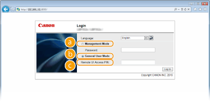 To log on in General User Mode, a Remote UI Access PIN must be set on the machine beforehand. Setting a Remote UI PIN