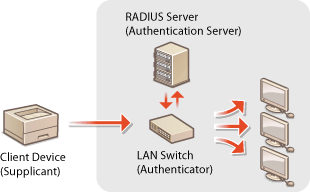 The machine can connect to an 802.1X network as a client device. A typical 802.1X network consists of a RADIUS server (authentication server), LAN switch (authenticator), and client devices with authentication software (supplicants). If a device tries to connect to the 802.1X network, the device must go through user authentication in order to prove that the connection is made by an authorized user. Authentication information is sent to and checked by a RADIUS server, which permits or rejects communication to the network depending on the authentication result. If authentication fails, a LAN switch (or an access point) blocks access from the outside of the network.