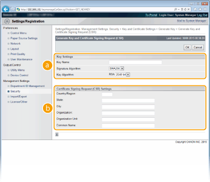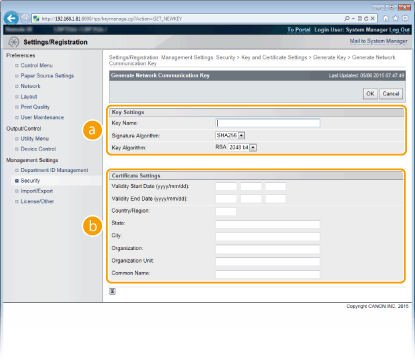 A key pair can be generated with the machine when it is required for encrypted communication via Transport Layer Security (TLS). You can use TLS when accessing the machine via the Remote UI or performing IPP Print. Up to eight key pairs, including the preinstalled pairs, can be registered. Self-signed certificates are used with key pairs generated in "Network Communication". With a "Key and Certificate Signing Request (CSR)", you can apply for a CA-issued digital certificate for the key pair generated by the machine.