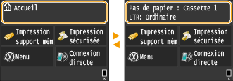 L'écran <Accueil> ou l'écran des paramètres s'affiche, ce qui vous permet de d'exécuter des fonctions telles que l'impression USB ou l'impression sécurisée. Vous pouvez également utiliser l'écran pour consulter des informations telles que des messages d'erreur et l'état de fonctionnement de l'appareil. L'écran est également tactile, ce qui vous permet d'effectuer des opérations en le touchant directement.
