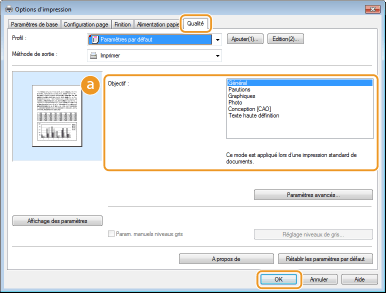Pour définir des paramètres détaillés pour chaque élément sélectionné dans [Objectif ], cliquez sur [Paramètres avancés]. Pour en savoir plus, cliquez sur [Aide], dans l'écran du pilote d'imprimante.