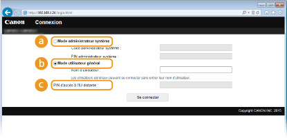 Vous pouvez effectuer toutes les opérations et tous les réglages de l'interface utilisateur distante. Entrez l'ID approprié dans [Code administrateur système] et le code PIN dans [PIN administrateur système] (