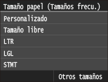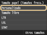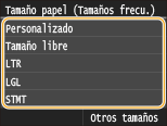 Si la pantalla anterior no aparece cuando hay papel cargadoSi siempre carga el mismo papel en la bandeja multiuso, puede omitir las operaciones de configuración del papel registrando el tamaño y el tipo de papel como opción predeterminada. Sin embargo, si se registra la opción predeterminada, la pantalla anterior no aparecerá. Para visualizar la pantalla, seleccione <Especificar cuando cargue papel> (Registro de las opciones de papel predeterminadas para la bandeja multiuso).