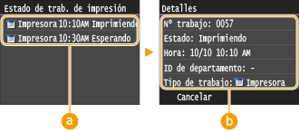 ![]() <Estado de trab. de impresión>Muestra la lista de documentos que se están procesando o a la espera de procesarse.