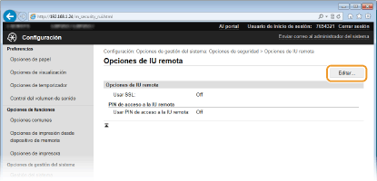 Marque la casilla de verificación [Usar PIN de acceso a la IU remota] y especifique el PIN.