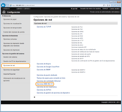Uso del panel de controlTambién podrá activar o desactivar la autenticación IEEE 802.1X desde <Menú> en la pantalla Inicio. Opciones IEEE 802.1X