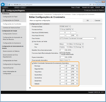 Marque a caixa de seleção [Definir Cronômetro Semanal de Encerramento Automático], e defina a hora de DESLIGAMENTO da energia.