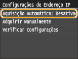 ![]() Se <Ativado> for exibido, toque em <Aquisição Automática> e defina ambos <Selecionar Protocolo> e <IP Automático> para <Desativado>.